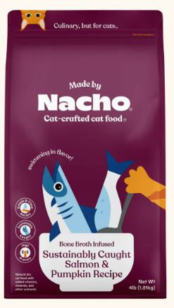 Bone Broth Infused Sustainably Caught Salmon and Pumpkin Kibble Made by Nacho Bone Broth Infused Salmon & Pumpkin dry cat food makes it a cinch to feed your cat healthy food they'll actually want to eat. We infuse every morsel with whisker-smacking dehydrated bone broth for claw-open-the-bag flavor in every bite. Premium, sustainably caught salmon is our first ingredient, full of essential fatty acids for nourished skin and glossy coats. Pre- and probiotics keep digestion on track, and naturally occurring DHA supports healthy cognition aka smarty pants cats. No fillers, no-nonsense, just the delectable dry cat food cats deserve.